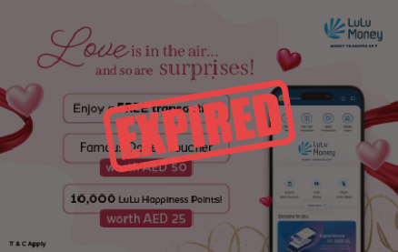 تحتفل لولو موني بعيد الحب بعرض ترويجي خاص. سيحصل العمالءالذين يقومون بمعامالتمؤهلة علىمكافآت، بما فيذلك قسيمة ديف الشهيرة بقيمة 50 درهما إماراتيا، وبدون رسوم تحويل، و10,000 نقطة سعادة. يخضع العرض الترويجي للشروطواألحكام التالية.